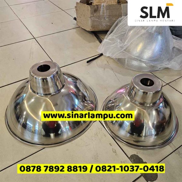 Kap Lampu Gantung Industri Stainless 12 Inch dan 16 Inch adalah kap lampu gantung industri bahan stainless warna silver dengan pilihan diameter 12 inch atau 16 inch untuk kombinasi fitting base E27, dan tersedia juga pilihan lubang fitting untuk E40 (dapat disesuaikan dengan kebutuhan E27 / E40, harap menginfokan saat pemesanan).
